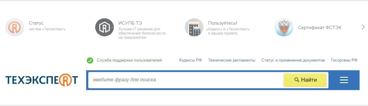 Профессиональная справочная система, объединяющая крупнейший фонд нормативных документов Информационной сети «Техэксперт» в электронном виде, а также справочно-консультационную информацию, подкрепленную комплексом сервисов и услуг для специалистов.